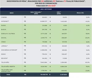 São Paulo, dezembro de 2025 – O investimento em mídia via agências no Brasil somou R$ 19, 4 bilhões entre janeiro e setembro deste ano, de acordo com o Painel Cenp-Meios, que consolida os espaços publicitários efetivamente comprados por 329 agências em todo o país. No período, o crescimento dos investimentos no segmento superou com folga o desempenho da economia brasileira: enquanto o setor avançou 9,07%, o PIB acumulado até o terceiro trimestre cresceu 2,4%, de acordo com o IBGE, uma diferença de quase quatro vezes, na comparação com 2024.