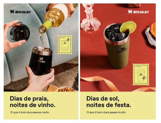 Frases como “Dias quentes. Goles gelados”, “Dias de folga, colheradas de frescor” e “Dias de sol, noites de festa” serão apresentadas nas mídias online, com o objetivo de evocar o melhor da temporada brasileira – que combina o clima de festas e descanso – ligando a performance (manutenção da temperatura) à ideia de que a Stanley 1913 é a companheira ideal em qualquer momento de celebração, reforçando tanto a identidade da marca quanto o estilo único dos produtos.