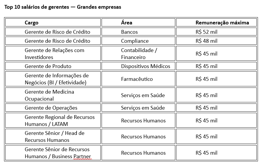 Entre as posições com maiores salários nas grandes empresas, predominam cargos ligados à gestão financeira e à governança corporativa. Além do gerente de Risco de Crédito, o cargo de gerente de Relações com Investidores aparece entre os mais bem remunerados. A área da Saúde também é destaque, com quatro gerências entre as mais bem pagas do país. Posições de Recursos Humanos fecham o quadro das maiores remunerações no nível gerencial (ver tabela).