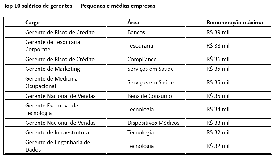 No universo das pequenas e médias empresas, além da gestão de risco de crédito, ganham destaque funções ligadas à gestão financeira e à expansão comercial. É o caso do gerente de Tesouraria, com teto de R$ 38 mil, e de posições comerciais nacionais em Bens de Consumo e Dispositivos Médicos.